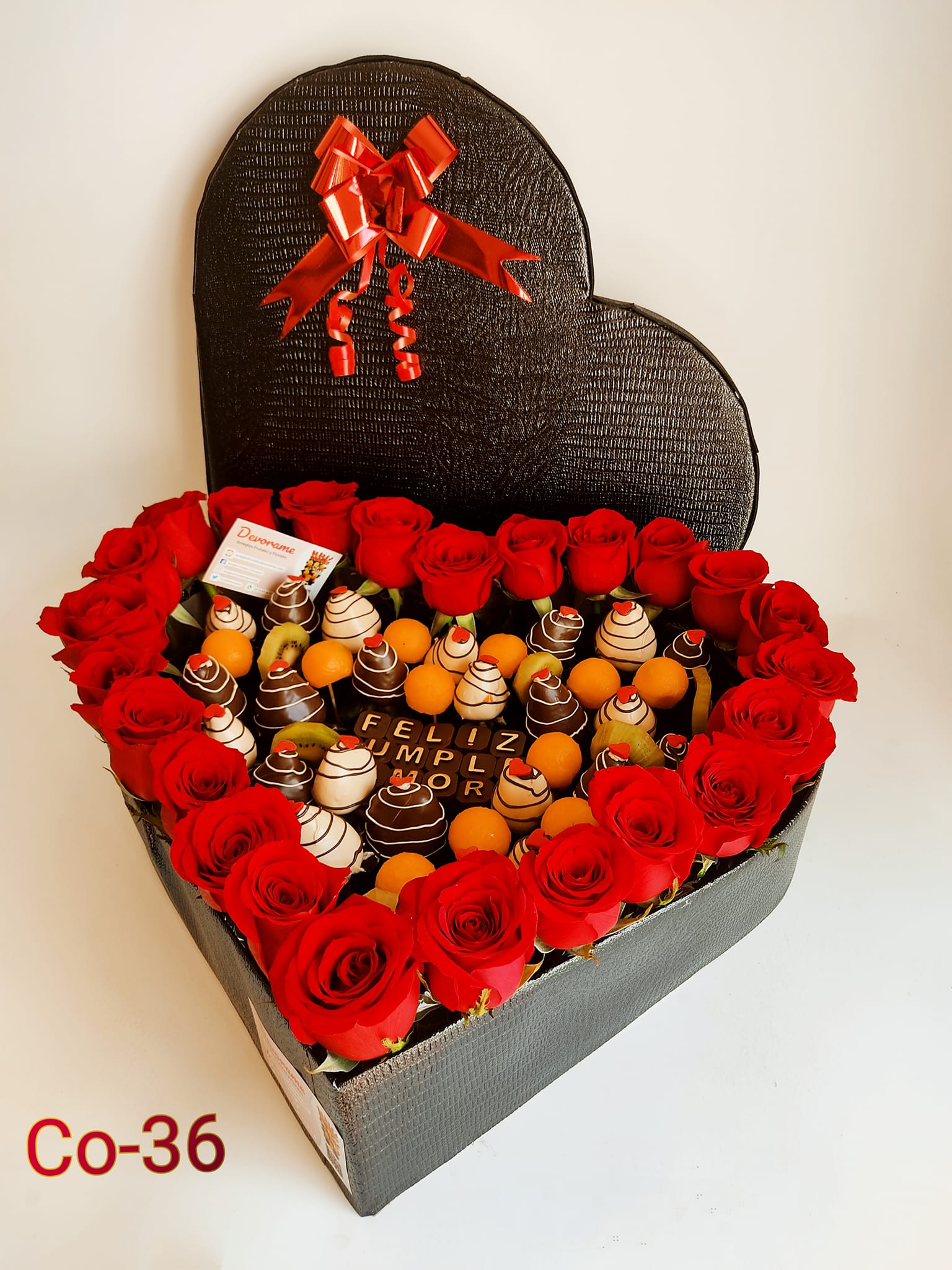 Corazón con rosas y fresascon chocolate. Elige el color de la rosa. Va protegido con tapa.